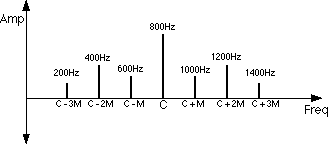 onde D é a quantidade de desvio em relação à frequência portadora e M a frequência da onda moduladora. Por exemplo, uma frequência portadora de 500Hz modulada por uma onda de 100Hz tem um índice de modulação I igual a 4. Quando I é maior que zero, os parciais (sidebands) ocorrem acima e abaixo da frequência portadora em intervalos regulares iguais a M. Quanto maior o I, maior o número de parciais, porém menor a amplitude de C. Pode-se assumir que a largura do espectro é aproximadamente duas vezes a soma do desvio D e da frequência modulante M:
